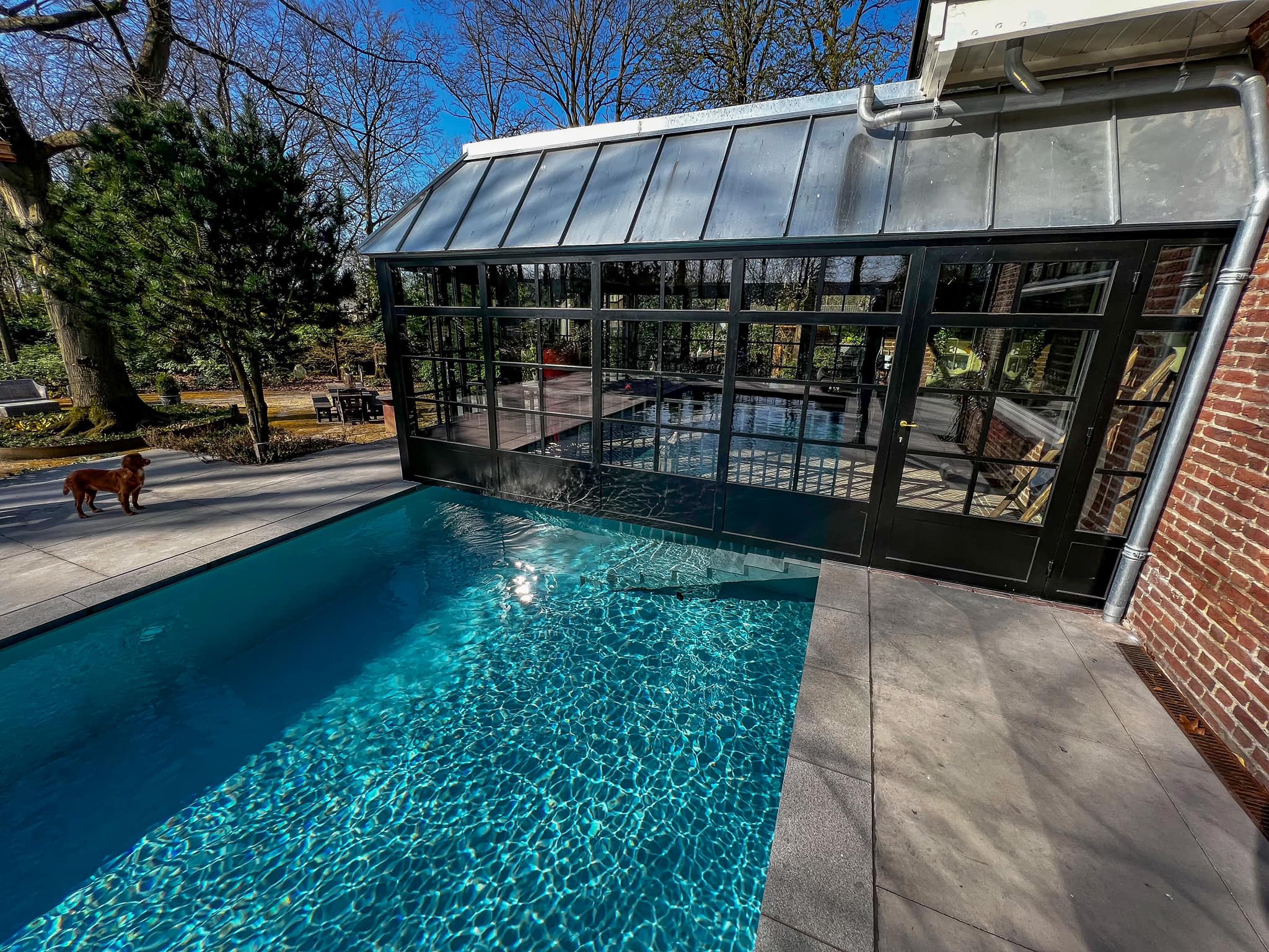 Verscholen in het het bos: dit unieke zwembad. Het zwembad biedt de klant een bijzondere zwemervaring, omdat deze zowel vanuit het woonhuis als de tuin toegankelijk is. Door onze maatwerk mogelijkheden hebben we in het woonhuisgedeelte van het zwembad een zwevende zwembadtrap geplaatst. Hiermee stapt de klant direct vanuit de serre het bad in.